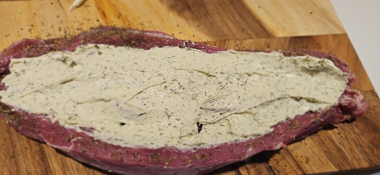 - Del svinefileten på langs nesten helt gjennom (som en bok), og bank den lett jevn. Krydre innsiden med litt salt og pepper.