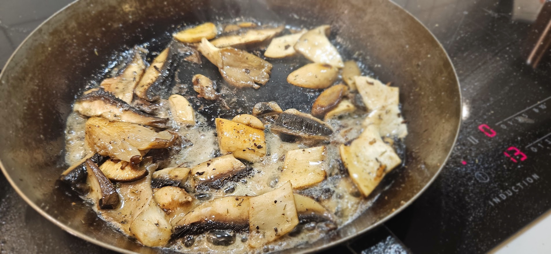 - Sopp: Varm en stor panne på middels høy varme. Stek soppen i tørr panne først til den slipper vannet og det meste har fordampet. Tilsett smør og litt olje, krydre med salt/pepper (og timian om du vil), og brun godt. Sett til side.