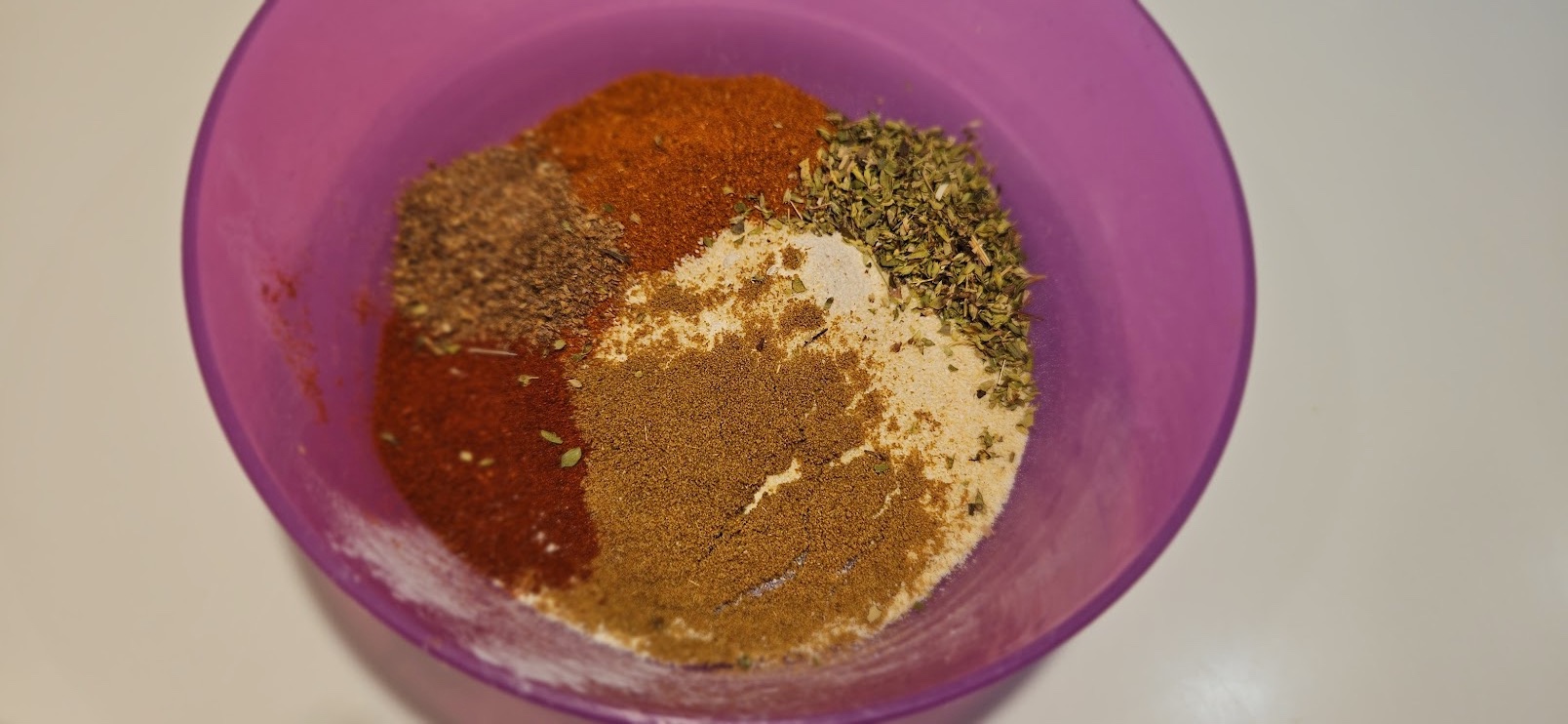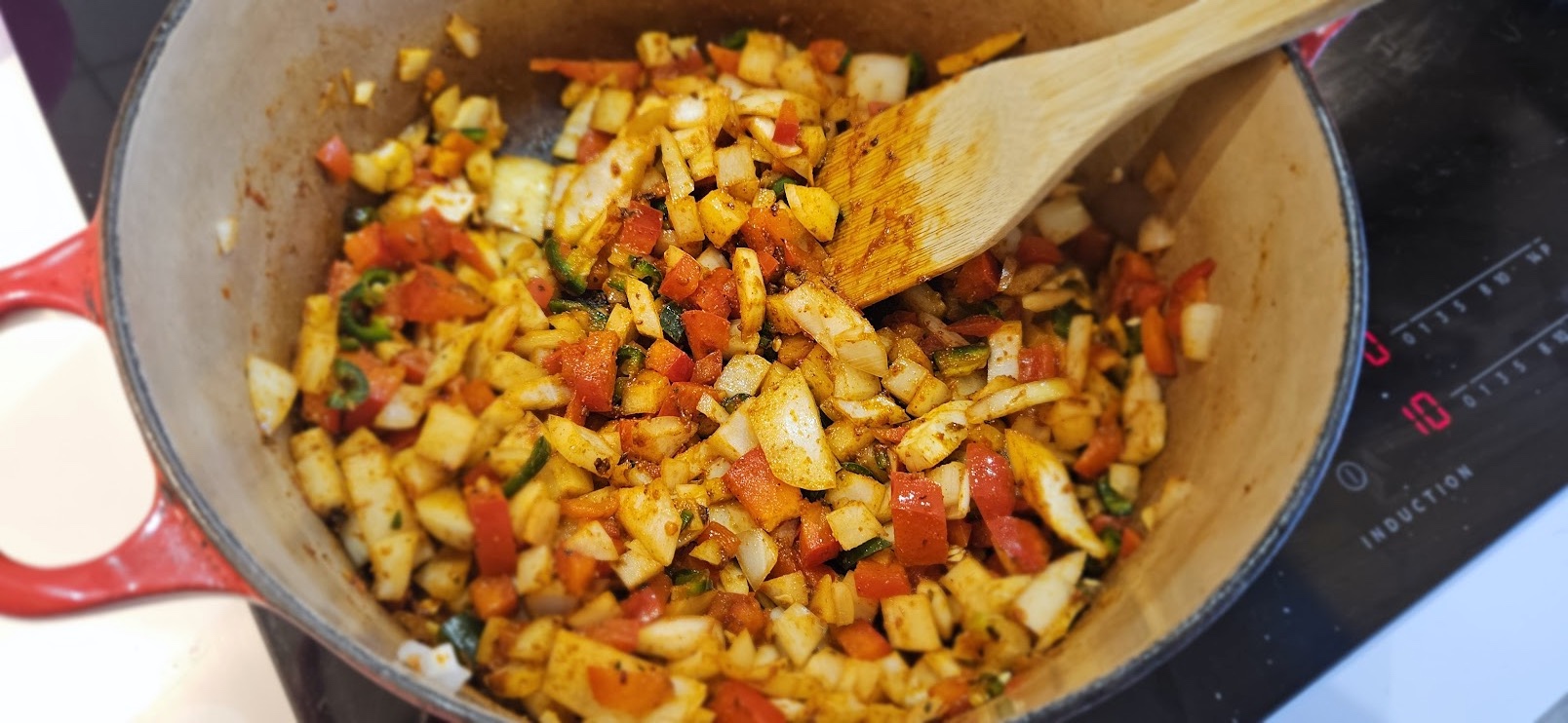 - Bland spisskummen, paprikapulver, hvitløkspulver, oregano, chilipulver, halvparten av pepperet og 1 ts salt i en liten skål. Kok risen etter pakken, eller bruk 300 g ris og 600 ml vann, og la den hvile med lokk.