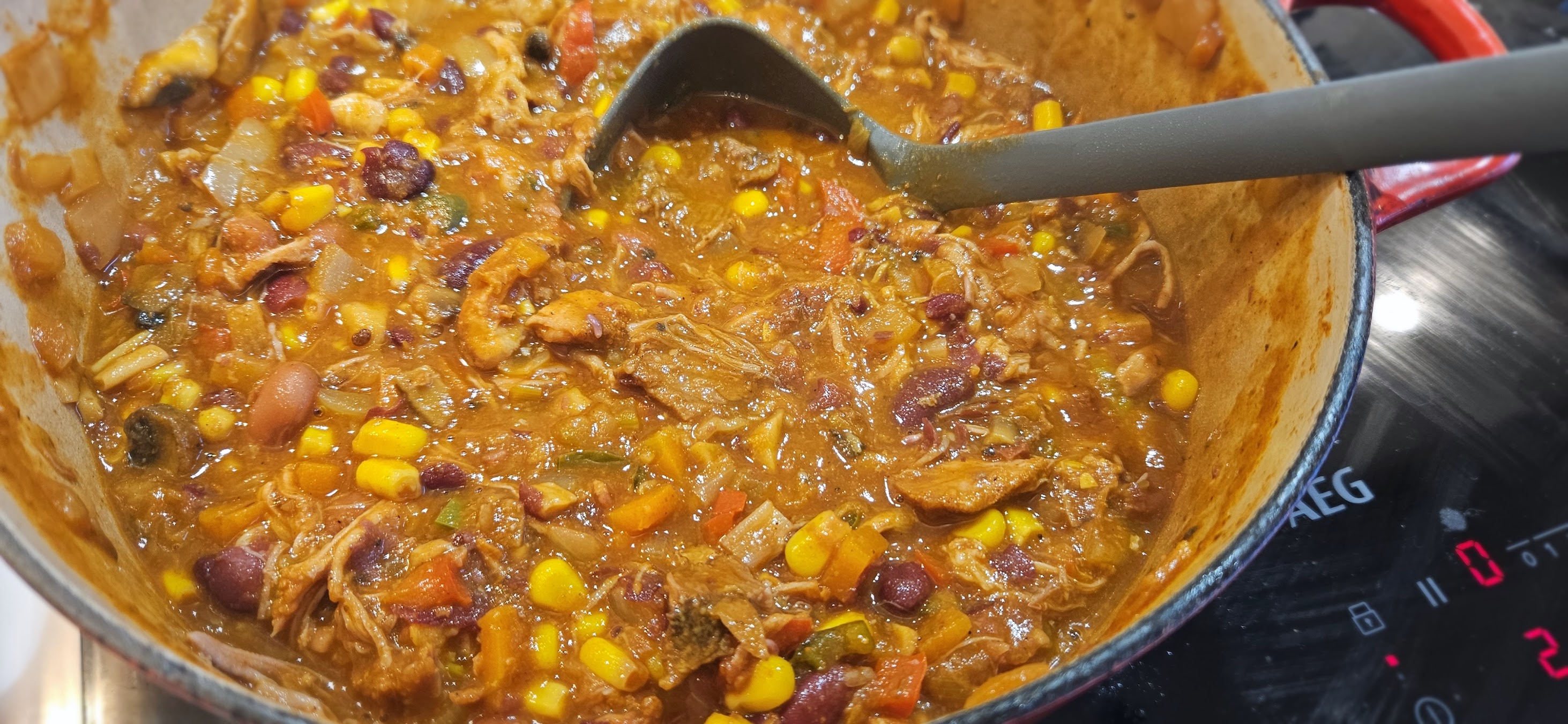 Dette er en chili som går litt bredere i smaken enn den klassiske kjøttdeigvarianten. Kylling, bønner, mais og mye grønnsaker gir en gryte som både er mettende og ganske snill å lage, mens ost, rømme, lime og chips på toppen gjør at den fortsatt føles som helgemat på en vanlig ukedag.