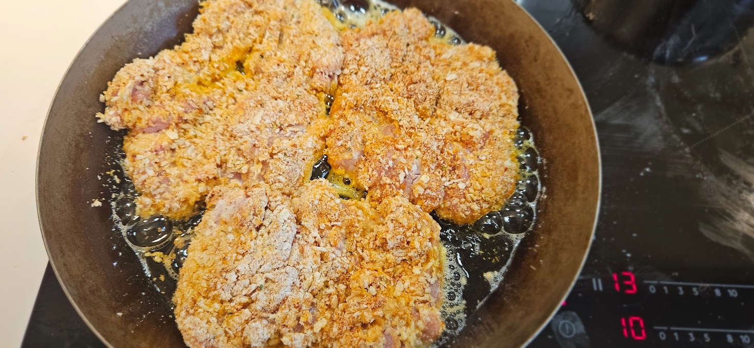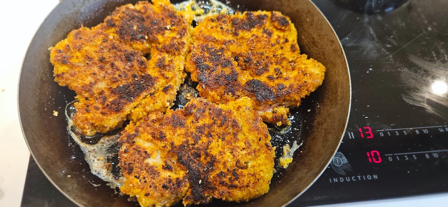 Kylling kan fort bli kjedelig, men her er en oppskrift som gir den et lite kick. Lag en blanding av panko (brødsmuler) iblandet krydder (løkpulver, hvitløkspulver, paprika, salt pepper). Sett frem tre skåler, først hvetemel, så 3 egg sammenvispet, så krydder/panko blanding. Kyllingen dypper du i hver av de, og hvis du er i godt humør så er det lov med en “double dip” der du gjentar prosessen. Så går hele herligheten i stekepanna med en god sprut olje. Stek på medium varme, siden kyllingen må gjennomstekes uten å brenne utsiden. Server gjerne med pommes frites og tartas-saus. Her hadde jeg bare bernaise sause til overs men det funket greit, men manglet litt syre.