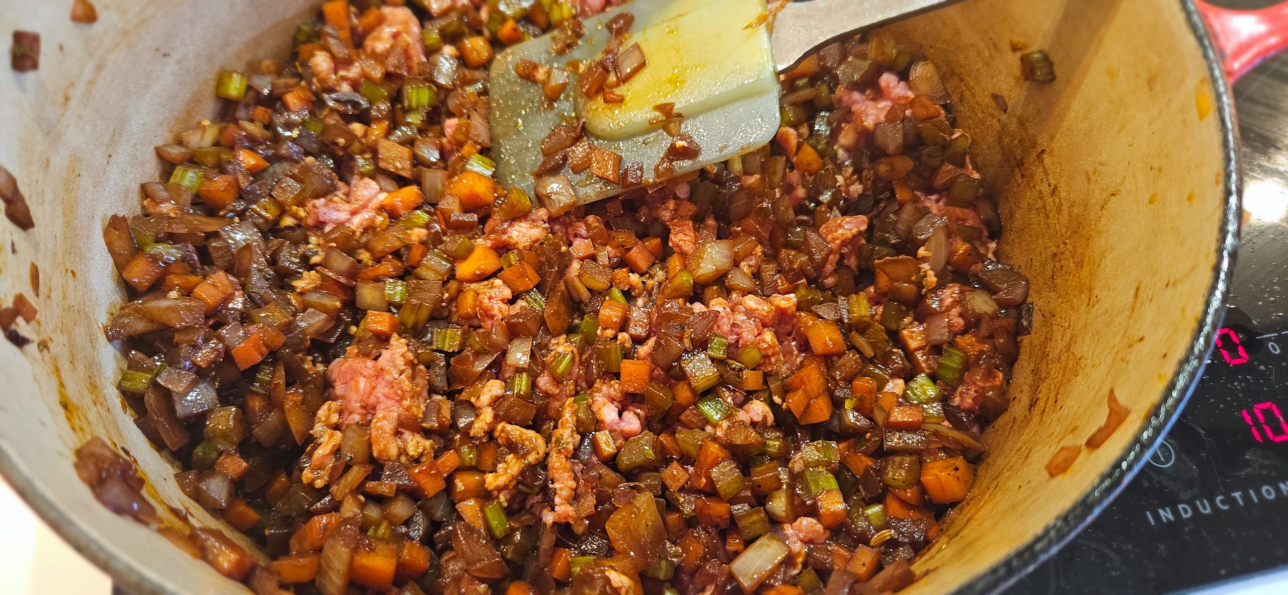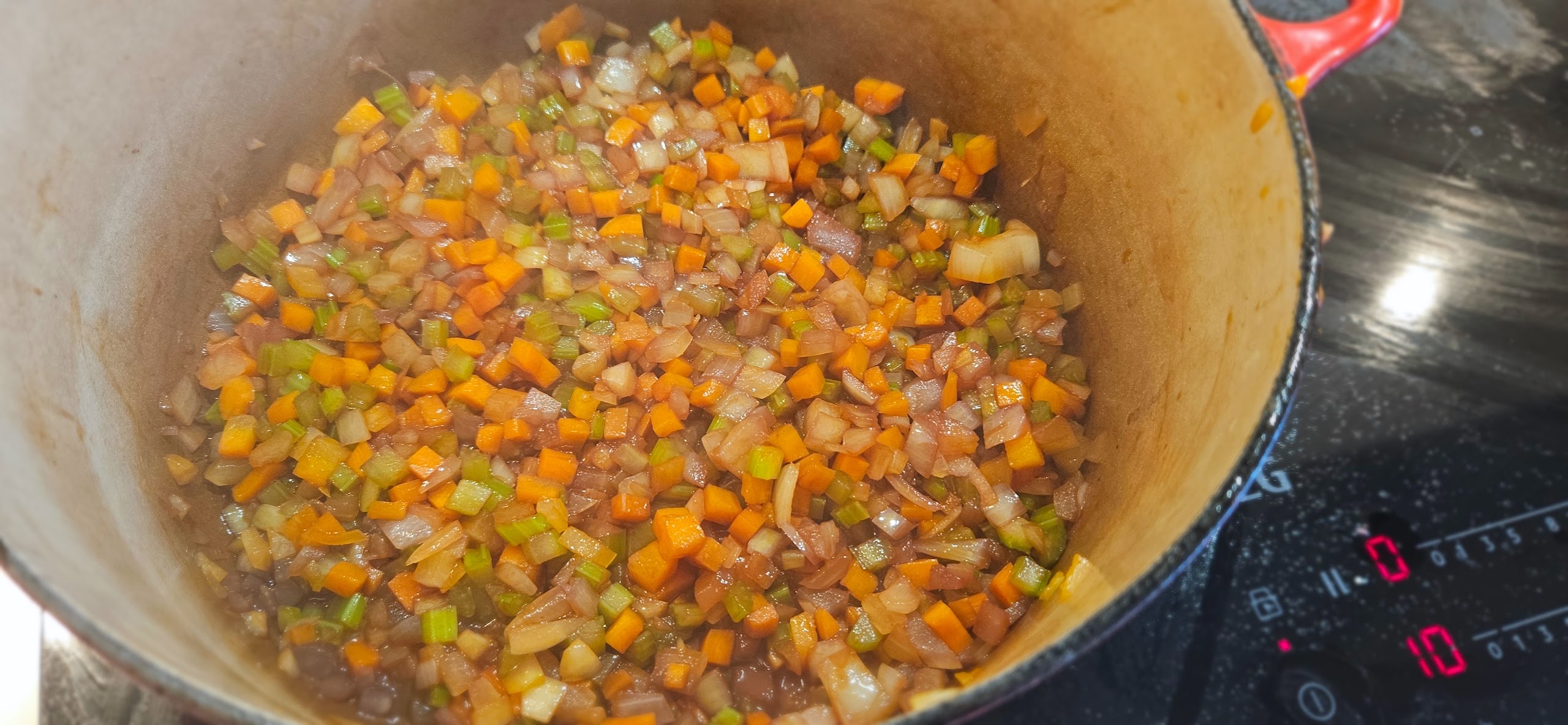 - Kutt sofrito: Kutt løk, gulrot og selleri i små terninger (rundt 4 mm hvis du orker). Dette gir jevnere saus og bedre tekstur.