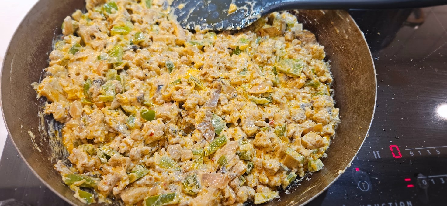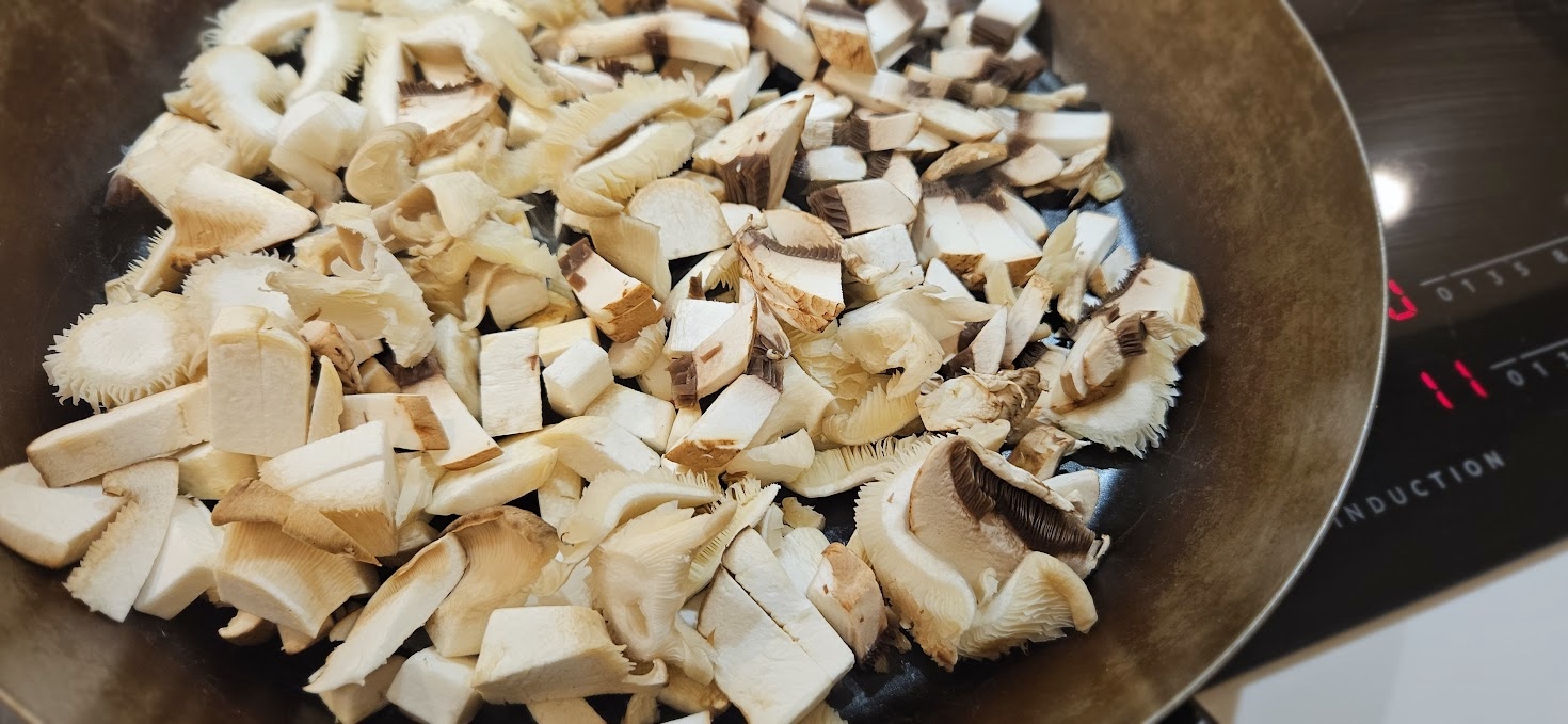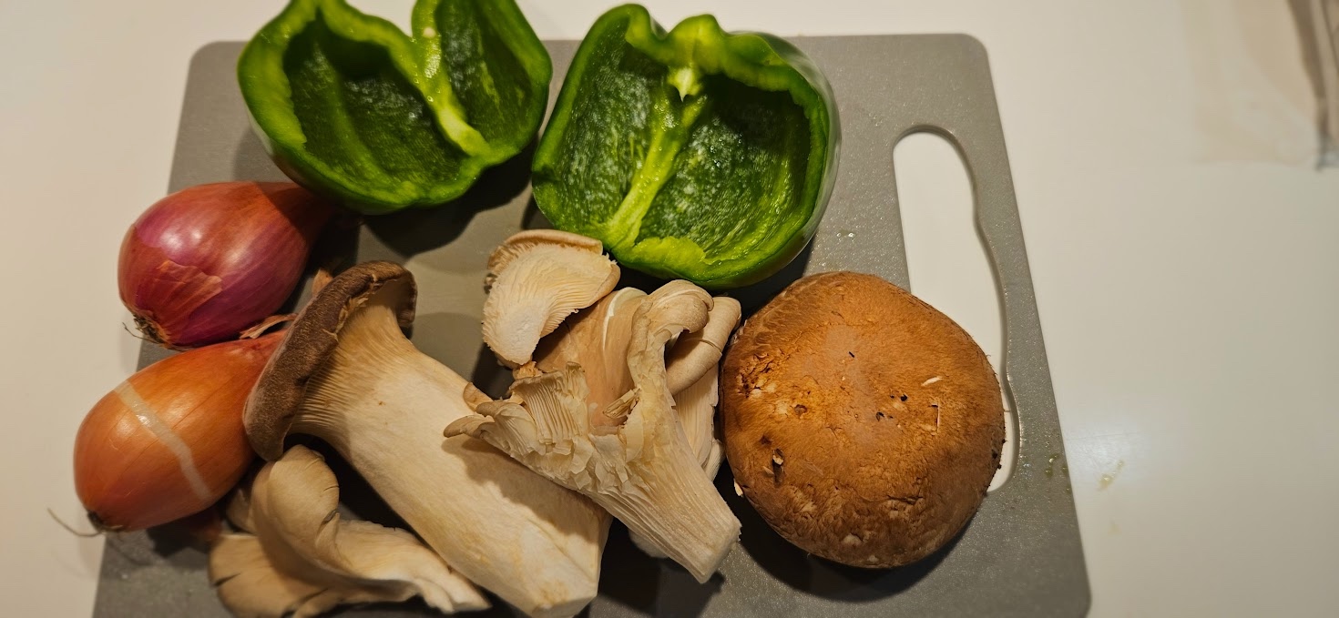 Her bygger vi smaken med sopp (gjerne steinsopp, østerssopp og portobello) som først tørrstekes til den slipper vann. Når den kan få skikkelig stekeflate, tilsetter du fett og bruner videre før grønn paprika og sjalottløk får bli med i panna sammen med salsicca.