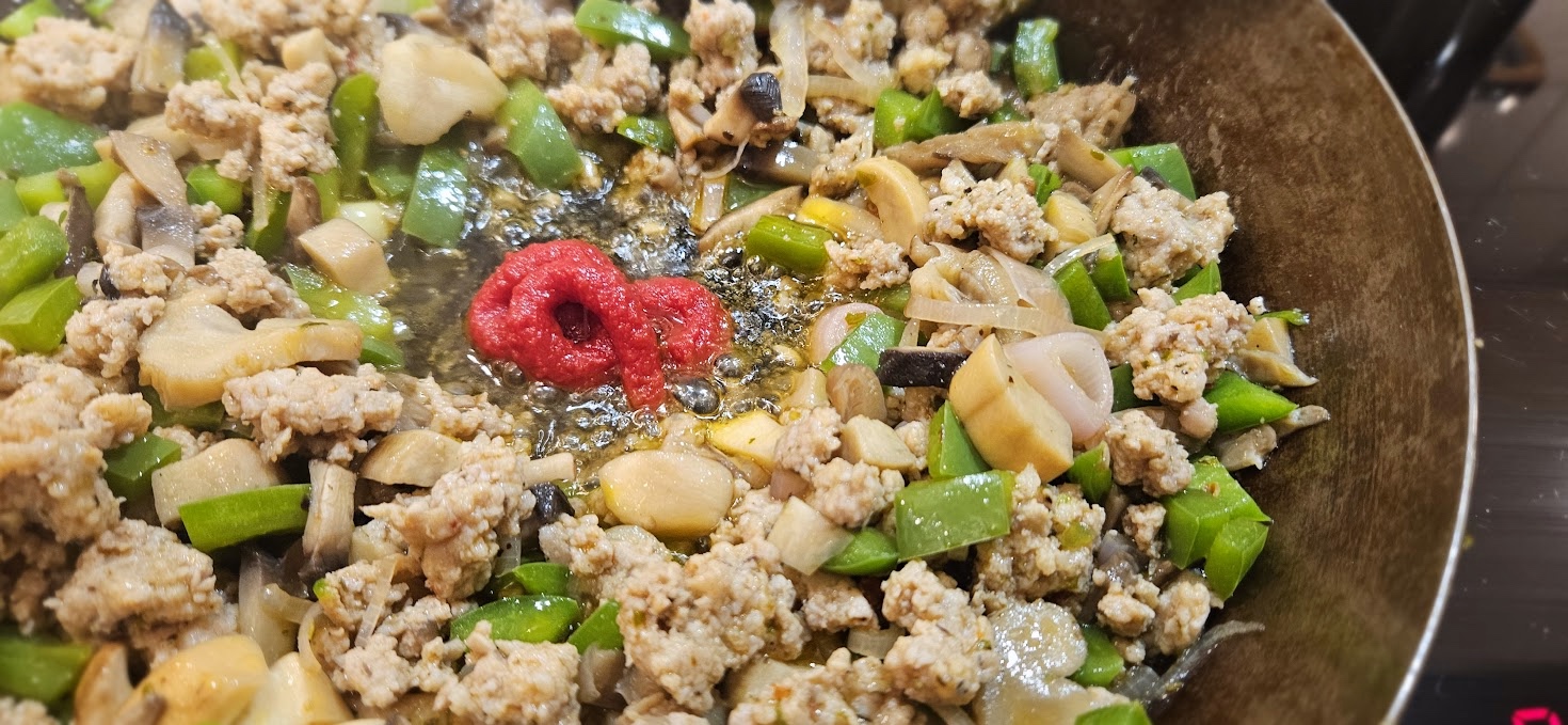 - Tomatpuré: Rør inn tomatpuréen og stek 1–2 minutter til den mørkner litt og lukter «søtt» (ikke rå).
