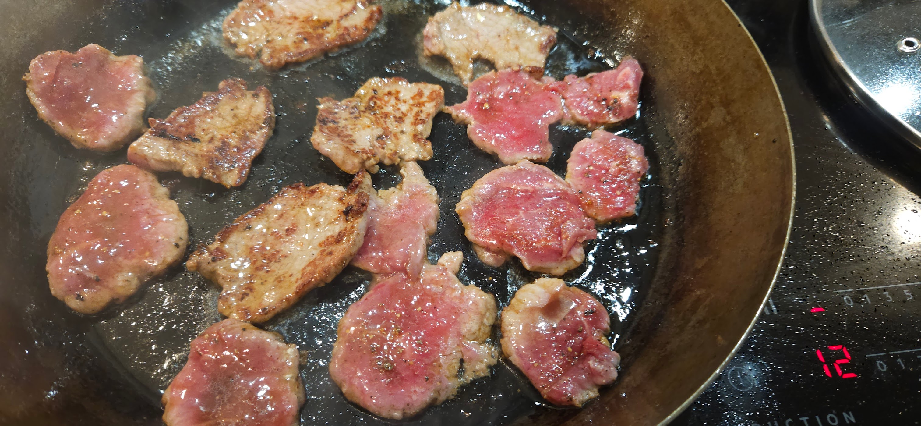 - Varm panna godt opp igjen med 1 ss olje. Stek kjøttet i et tynt lag, 10 til 20 sekunder per side for helt tynne skiver og opptil 1 minutt for tykkere biter. Jobb i små runder så kjøttet får farge uten å koke.
