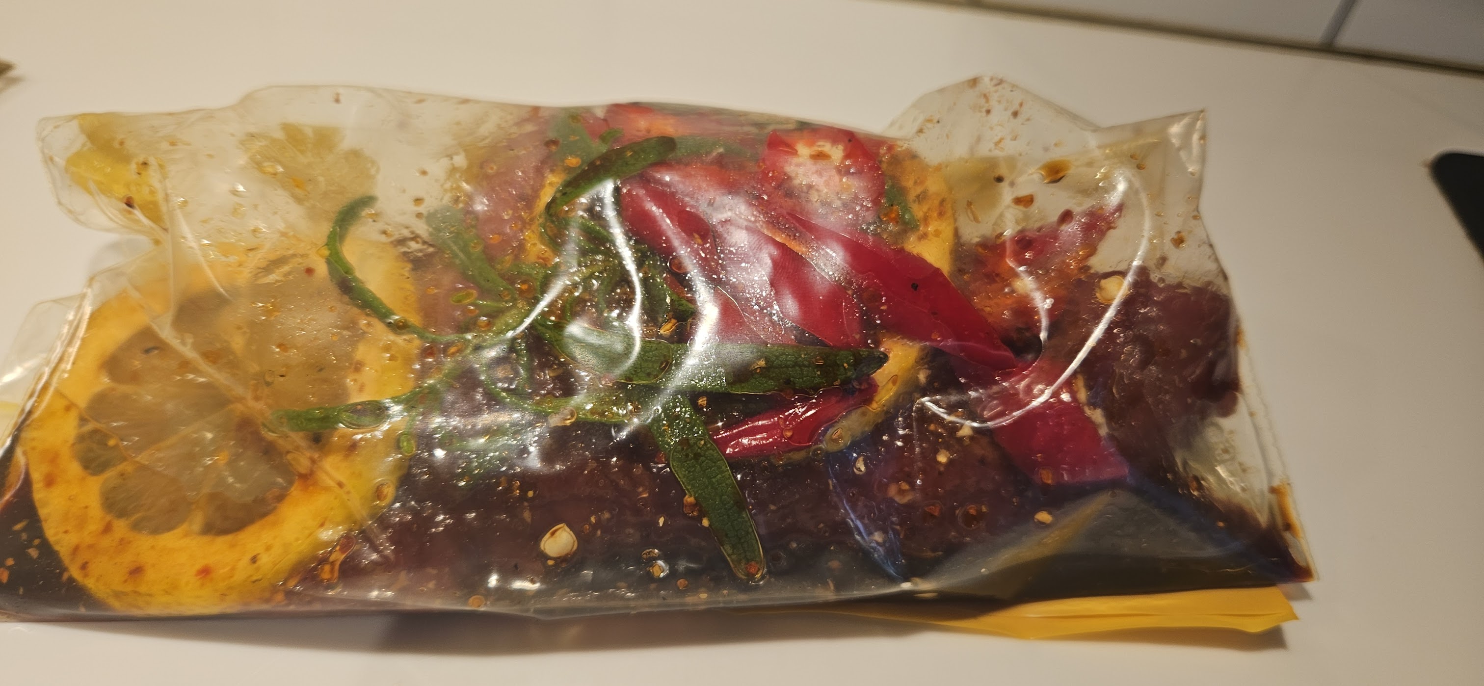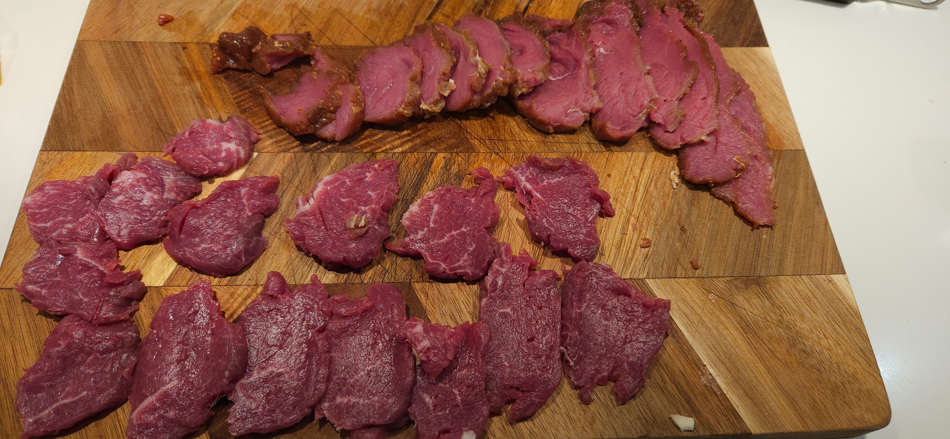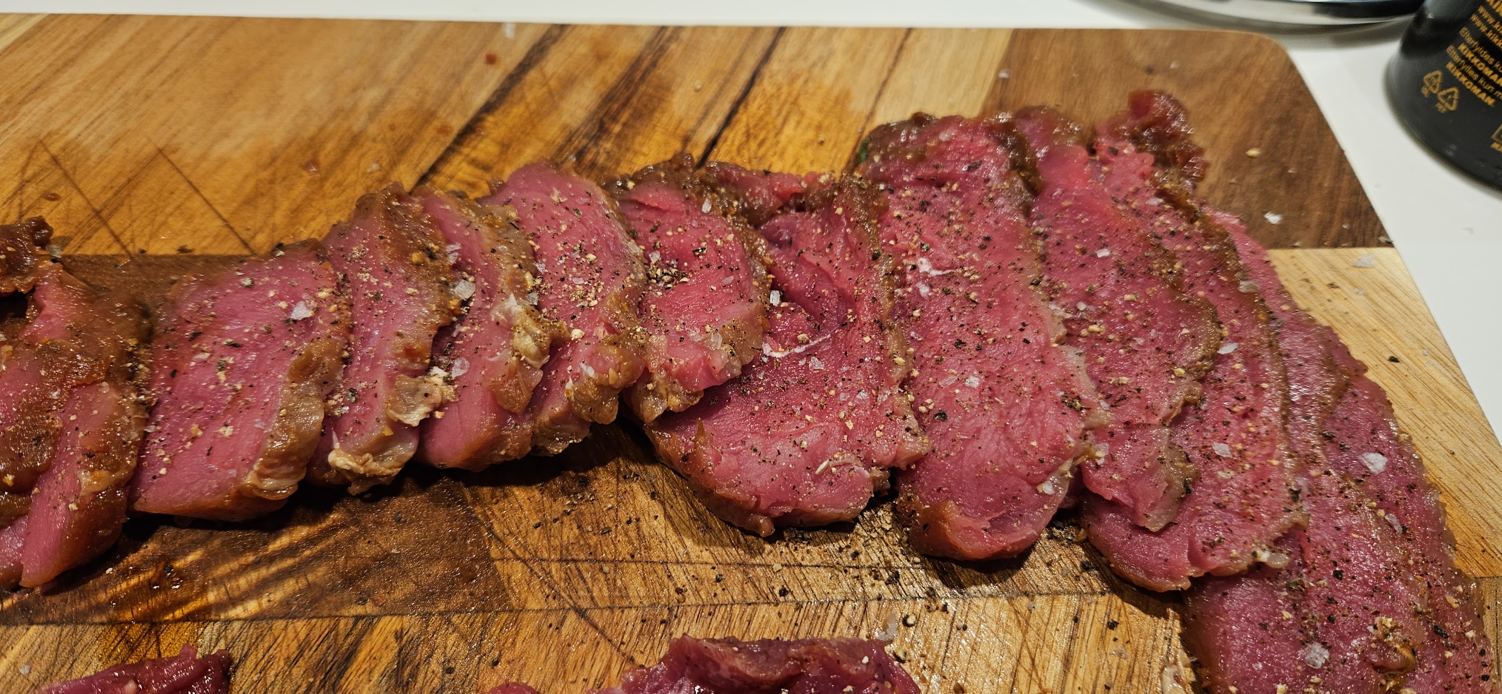 - Ta kjøttet ut av marinaden og tørk det lett av. Skjær det i tynne skiver. Krydre med salt, pepper og en liten skvett soyasaus.