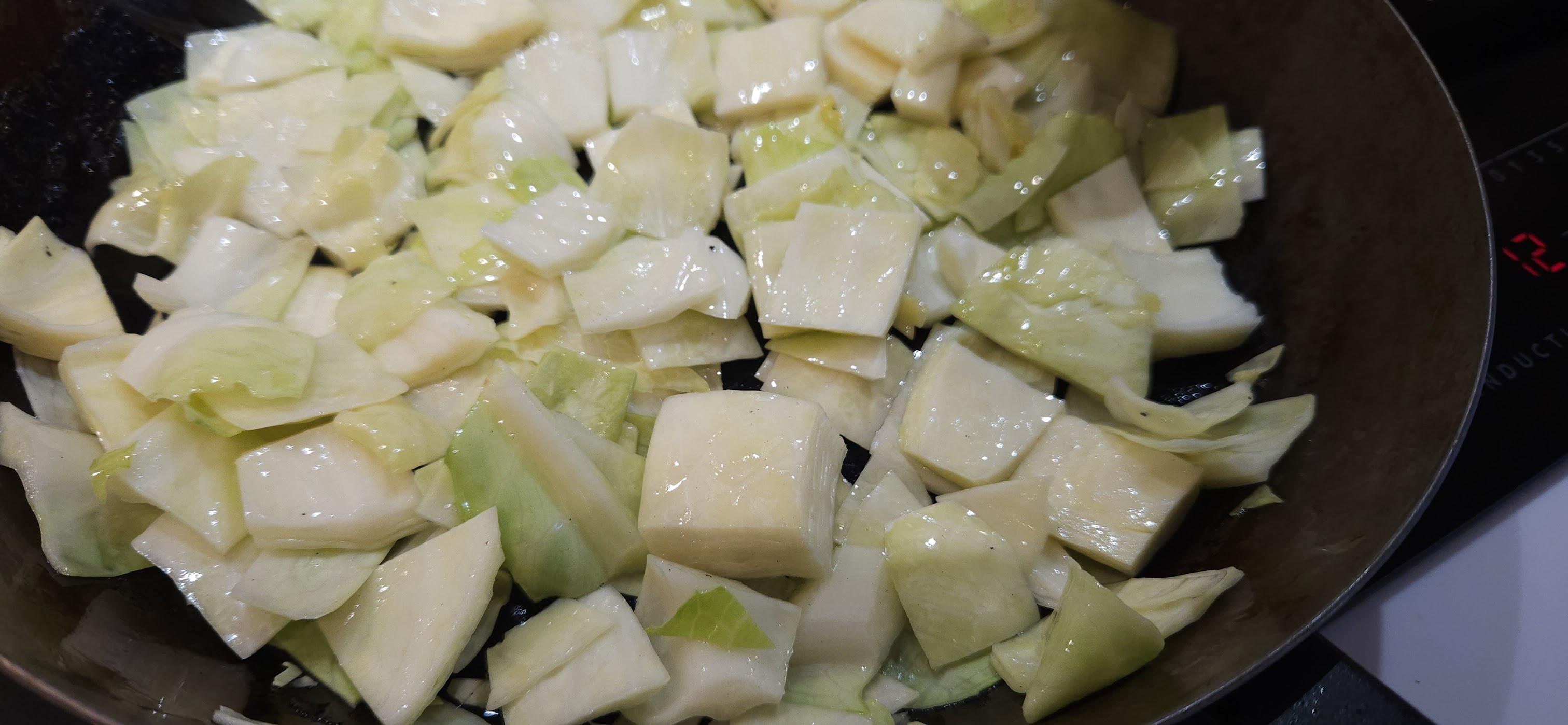 - Varm en stor stekepanne med 1 ss olje. Stek kålen raskt på høy varme i 2 til 3 minutter til den får litt farge i kantene. Flytt den over i misogryta og la den trekke videre der.