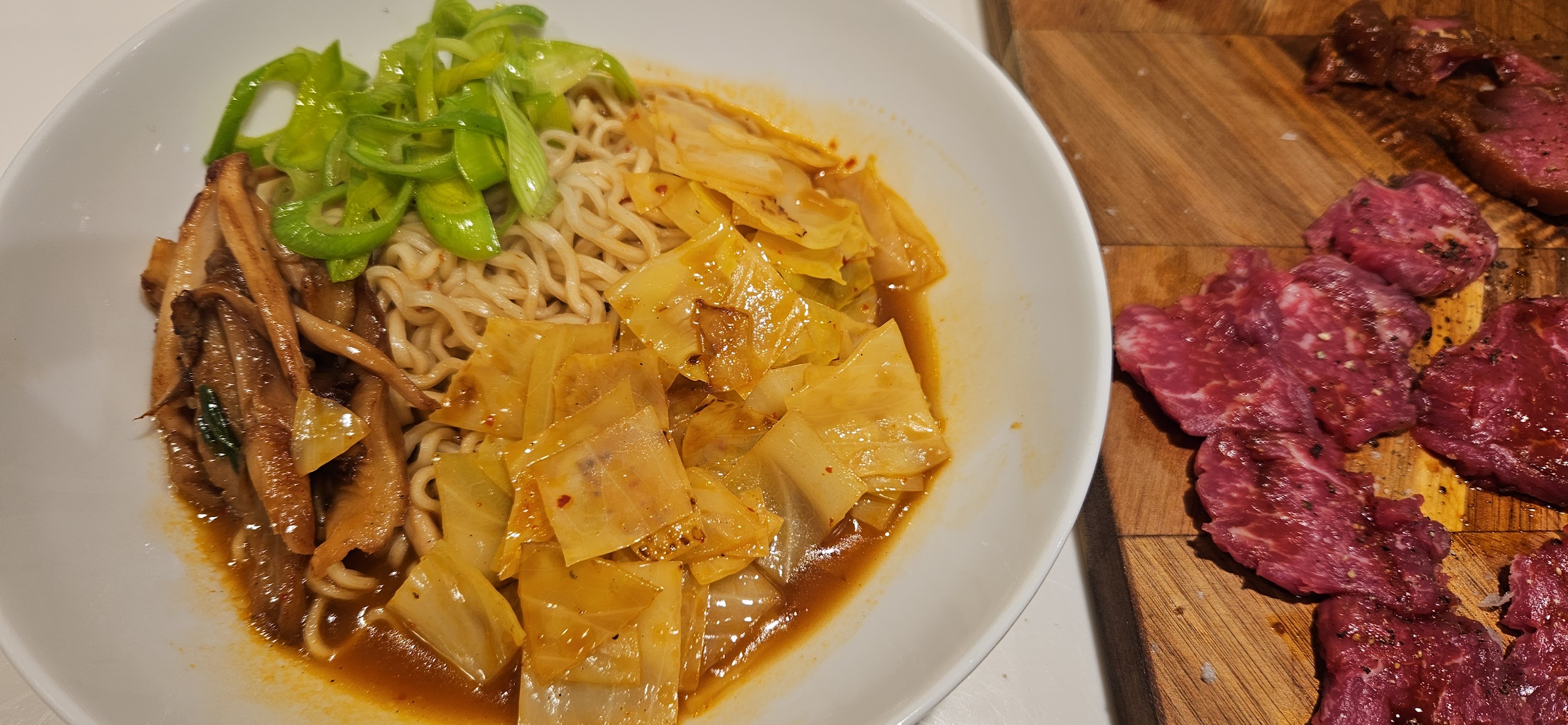Dette er også en middag der timing slår kompliserte teknikker. Har du nudlene klare, eggene med bløt plomme og gryta varm, trenger zebraskivene bare noen sekunder per side før du kan servere.