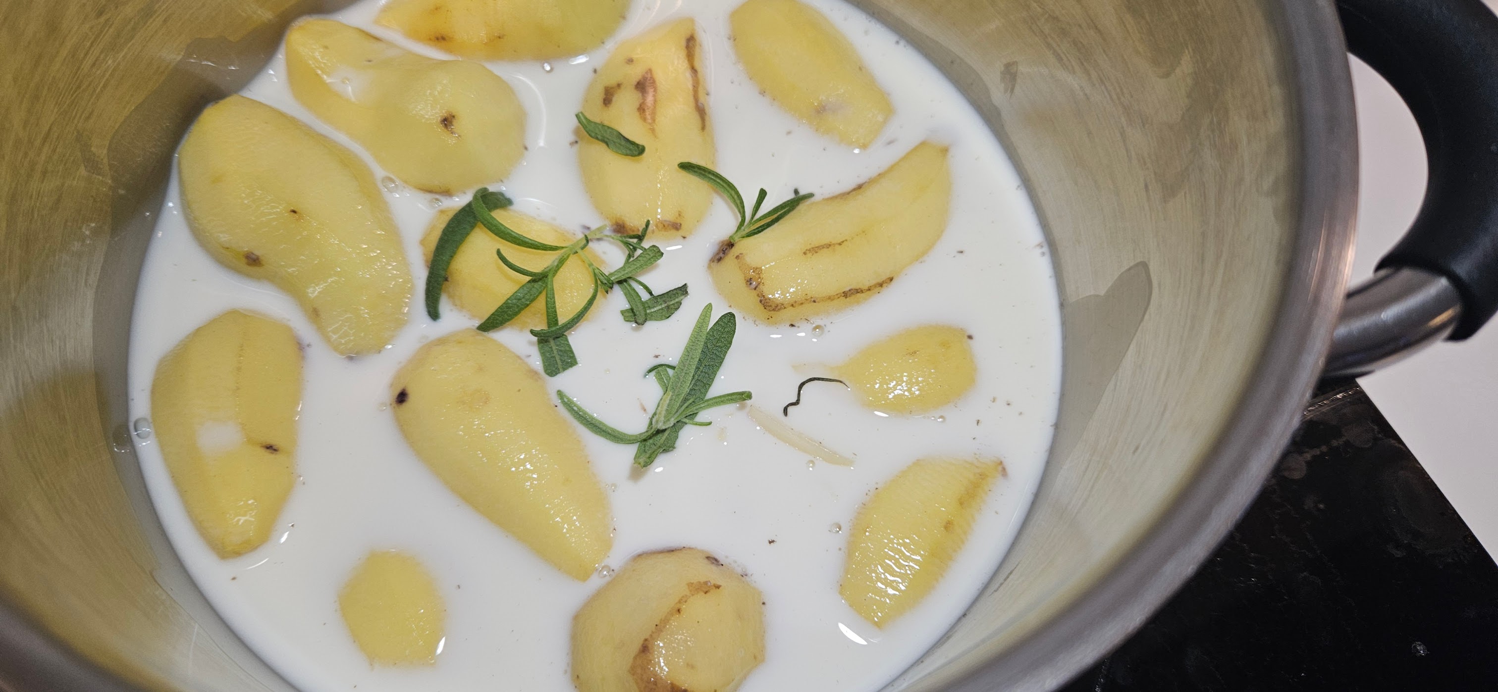 - Ha potetene i en kjele med melk, nok vann til at det så vidt dekker, 2 skrelte hvitløksfedd og en liten kvist rosmarin. Kok til potetene er helt møre, 20 til 25 minutter.