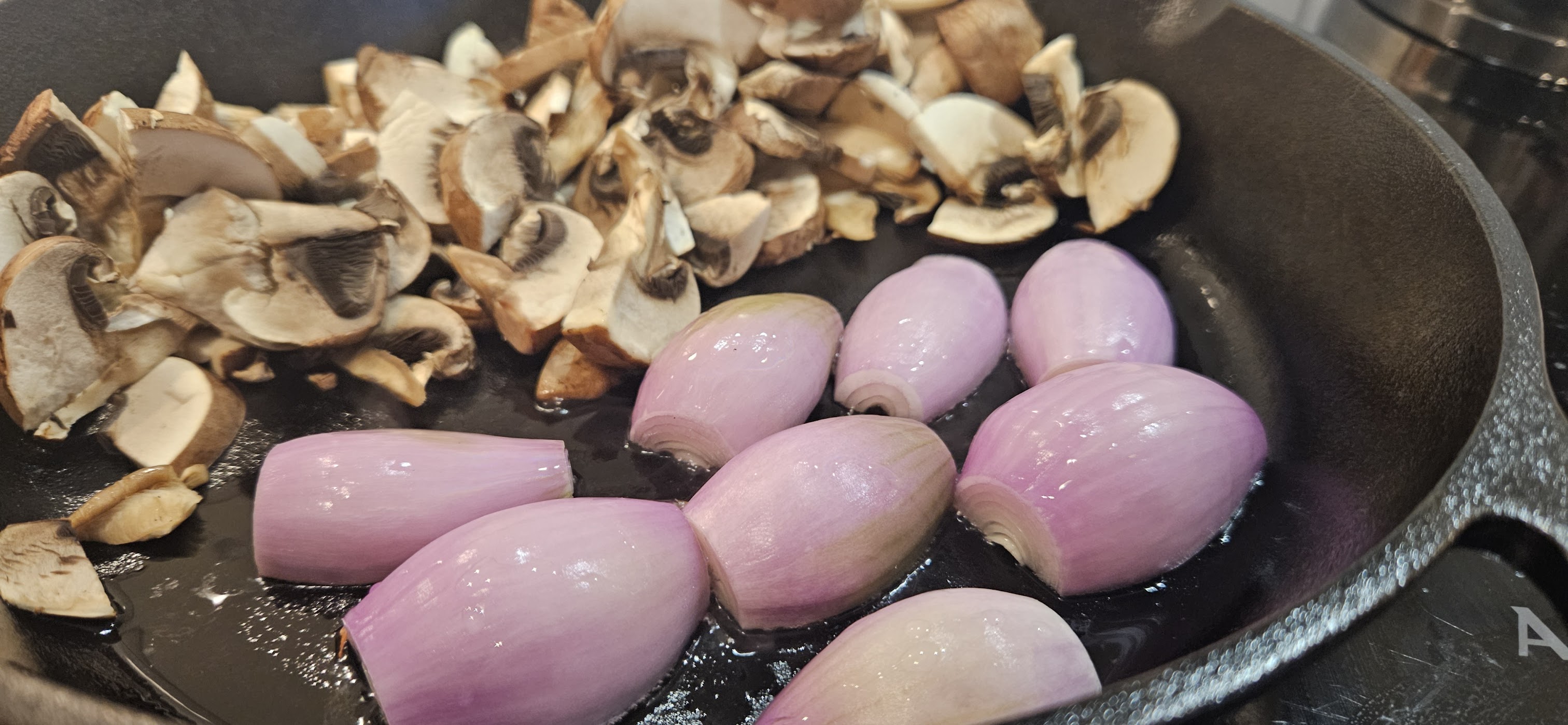 - Hold sopp og sjalottløk varme mens du gjør resten klart. Det som blir igjen i kjøttpanna etter steking er nok saus her, så lenge du ikke vasker bort smaken.